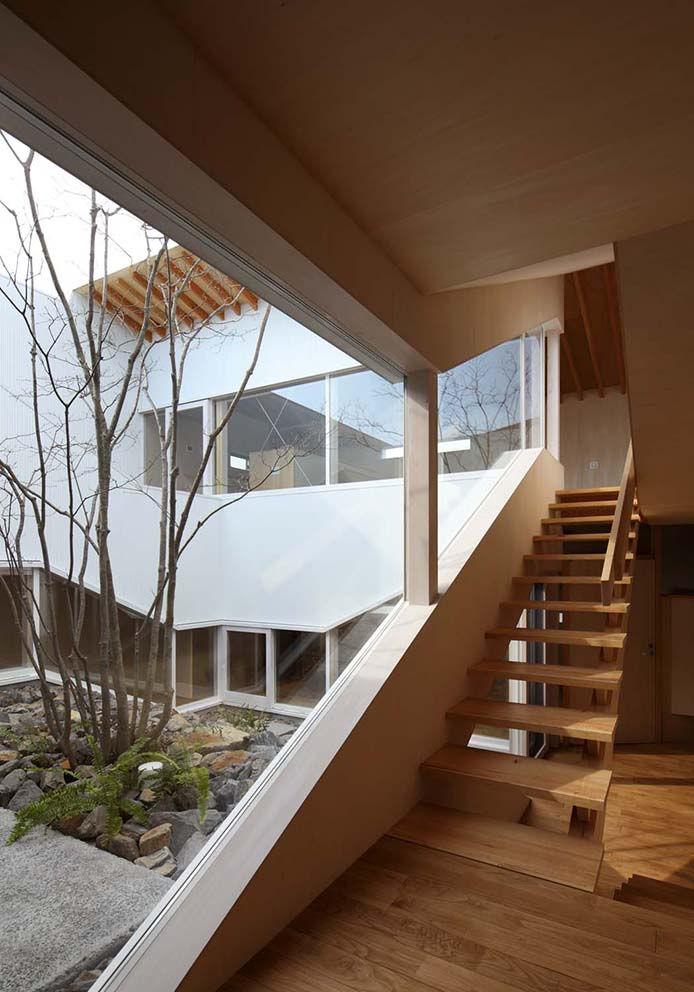 中庭・スキップフロアの住宅です。2世帯住宅としてつくられていますが、中庭を巡る空間全体は、将来1つの住宅になっても緩やかに連続して機能するように考えられています。